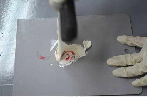根據(jù)所取原子灰的量,按照其與固化劑的比例為100:2或100:3加入固化劑,加入固化劑前,必須對(duì)固化劑進(jìn)行攪拌(碾壓固化劑瓶身即可)。