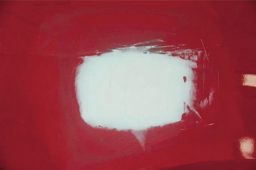 ①砂紙打磨法。在原子灰干燥過程中,可以拿80#的砂紙輕輕地打磨原子灰邊緣薄的部分,檢查原子灰是否已經(jīng)干透。如果沒有干透,則在砂紙上會(huì)粘有原子灰;如果已經(jīng)干透,則不會(huì)粘上原子灰,并在原子灰上出現(xiàn)堅(jiān)硬的白色痕跡。如圖2-52所示。