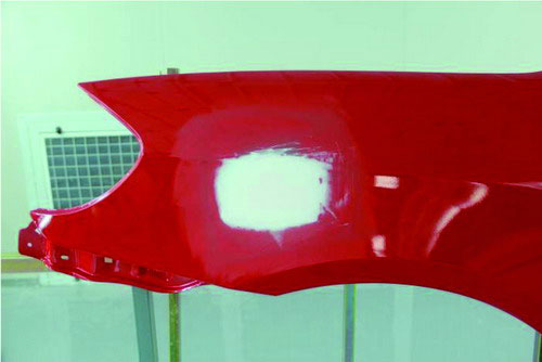 ⑤用上一步的方法,對(duì)整個(gè)面進(jìn)行收邊,使原子灰的邊緣薄,原來中間凹坑區(qū)域飽滿。如圖2-46所示。