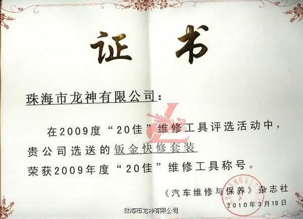 2010年北京汽保春季展期間,由中國汽車保修設(shè)備行業(yè)協(xié)會和《汽車維修與保養(yǎng)》雜志共同舉辦的2009年度“20佳”維修工具頒獎(jiǎng)典禮,于2010年3月18日在北京江河水鳥巢麗景隆重舉行,龍神“鈑金快修套裝”在眾多候選產(chǎn)品中脫穎而出,獲得本屆評審委員會專業(yè)評委的一致認(rèn)可:符合產(chǎn)品創(chuàng)新性、實(shí)用性、效率性,可幫助企業(yè)提高工作效率,授予“中國汽車維修市場2009年度20佳”榮譽(yù)稱號。
